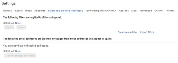 - Navigate to "Filters and Blocked Addresses" in the top menu.