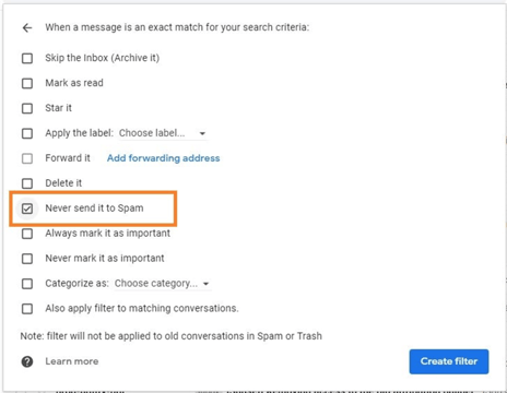 Doing so will ensure that emails that meet the criteria you specified never end up in Spam or Trash (unless you do so manually).
