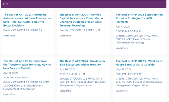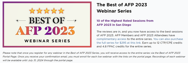 To view The Best of AFP 2023 webinars click here and scroll down to the Best of AFP 2023 section.