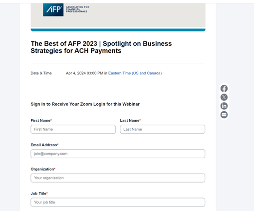After you have purchased access to the Best of AFP 2023 Series Portal through AFP, you must complete your Zoom sign-in requiring your name and email by clicking the “Zoom link to enroll in the live webinar” for each webinar you wish to attend.