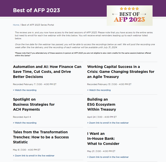 The Best of AFP 2023 Series Portal includes a “Zoom link to enroll in the live webinar” for each of the various upcoming webinars. One week after the webinar, you can “Watch the recording” until July 31, 2024.